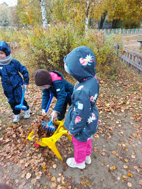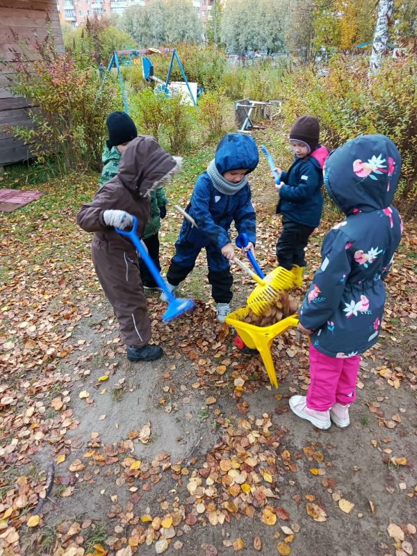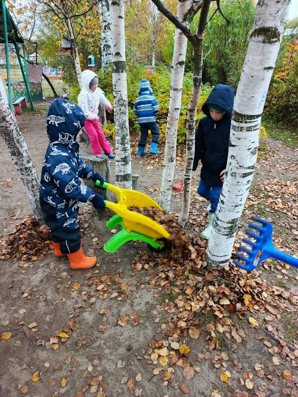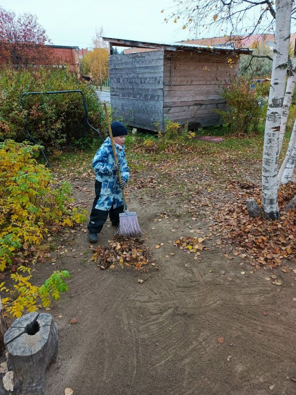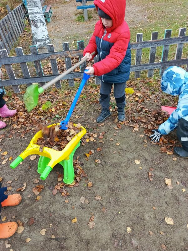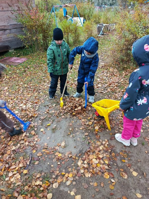 Воспитанники подготовительной группы «Барбарики» (Корпус №1 «Родничок») активно трудятся на своем участке. Ребята с удовольствием и с энтузиазмом сгребают листья, собирают опавшую листву в мешки, а в свободное от работы время любят делать салют из листьев и собирать самые красивые листики в букеты для мам.