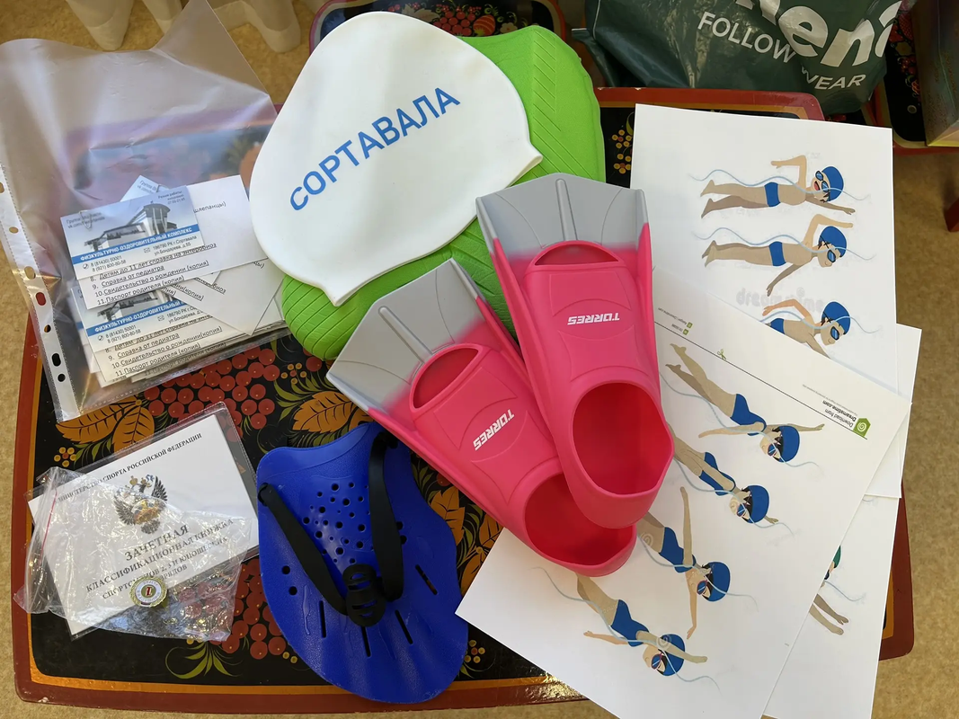 Ребятам показали профессиональный инвентарь — доски для плавания, лопатки и ласты, которые помогают быстрее освоить водную стихию.