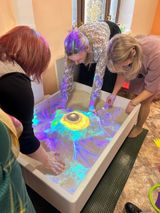 - Педагог-психолог Кузнецова Наталья Юрьевна продемонстрировала программно-методический комплекс Моби Дуэт, который позволяет развивать навыки социального и коммуникативного взаимодействия дошкольников; каскад с фибероптическим волокном, сухой душ, световой планшет.