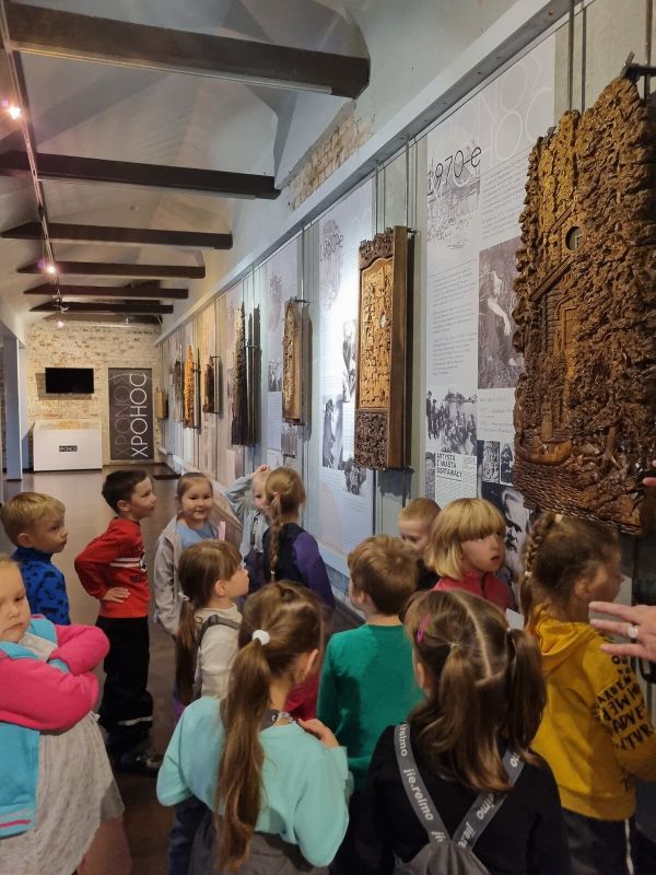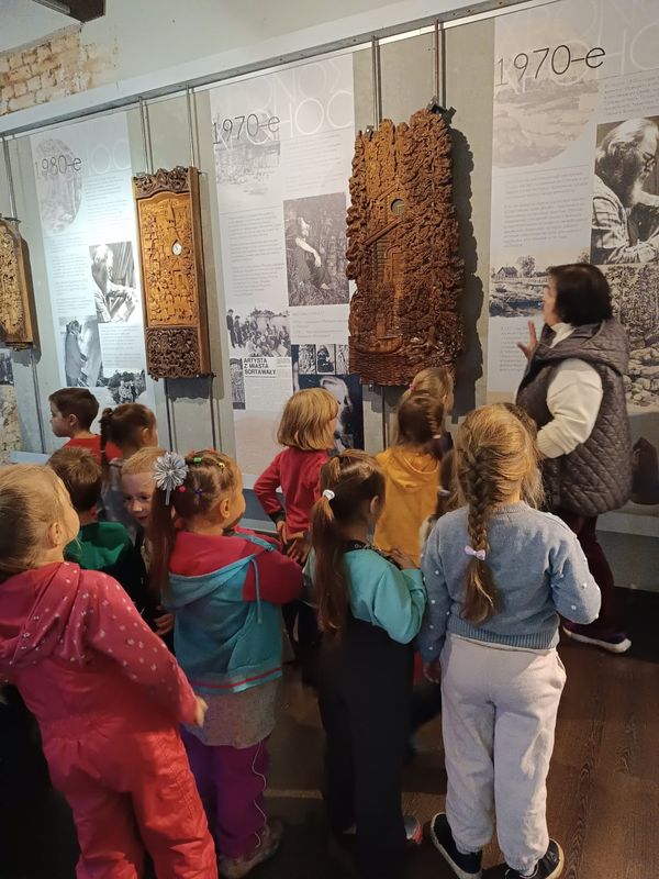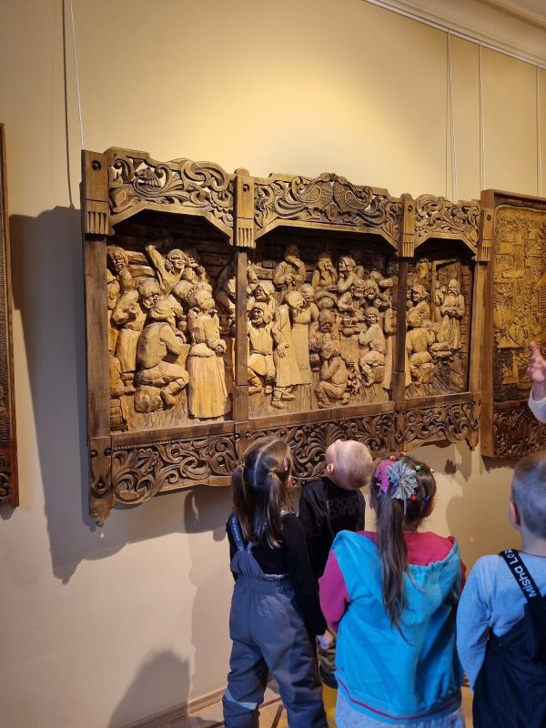 Дошкольники увидели уникальные резные деревянные картины с сюжетами из жизни и быта простого народа, пейзажи, фрагменты из сказок. Особое впечатление на ребят произвели резные деревянные часы и необычный «стол мастера», где кроме чертежей-набросков лежат инструменты, которые использовал Кронид Александрович для резьбы по дереву.