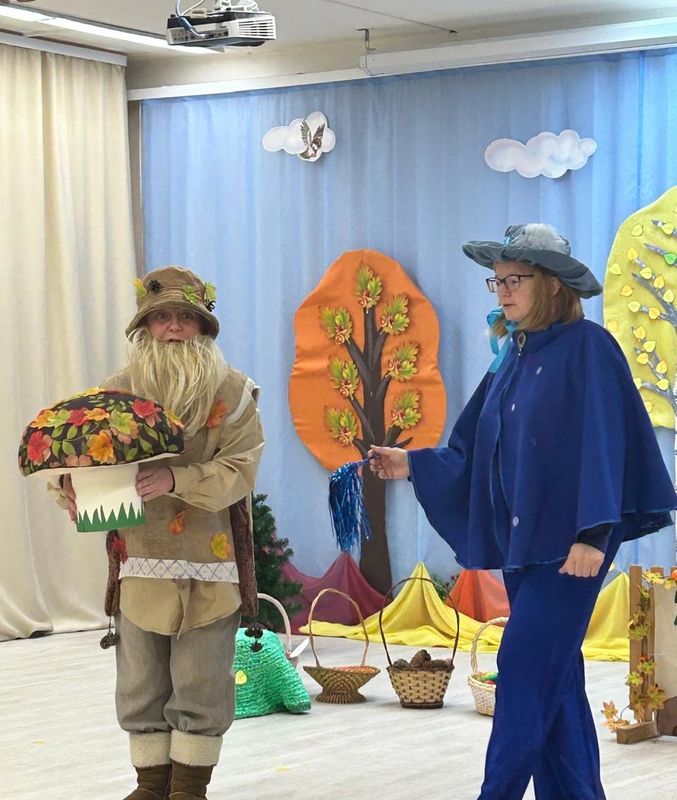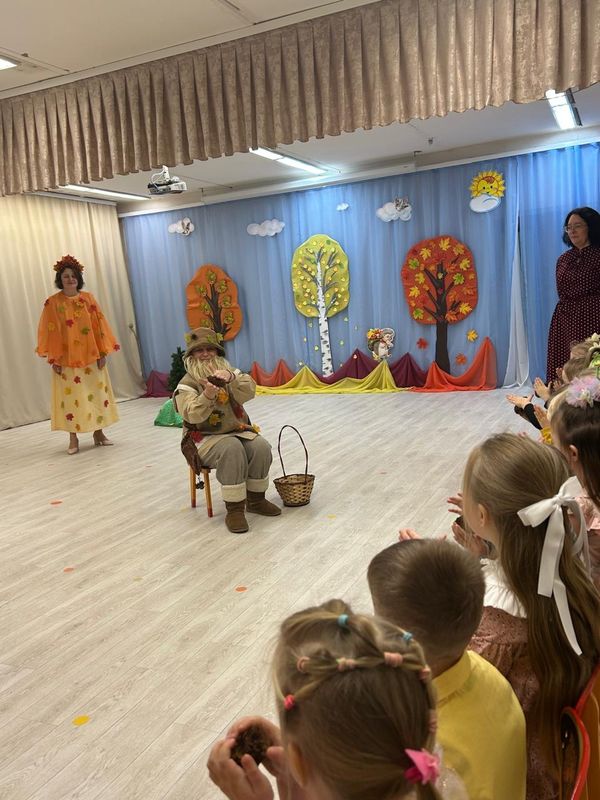 На праздник к дошколятам пришли Красавица- Осень с осенними дарами, Лесовичок, который порадовал детей игрой с шишками и с осенними листочками. И Тучка, которую дети порадовали своими стихами и танцем.