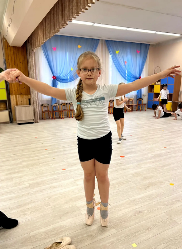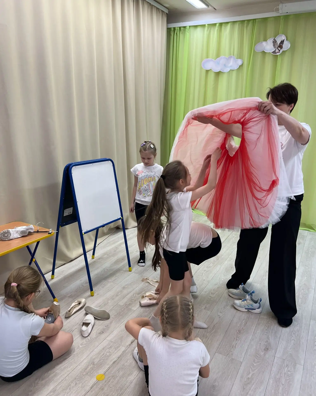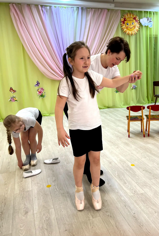 Ребята окунулись в мир искусства, познакомились с профессией балетмейстер, узнали, что в балете движения имеют свои звучащие на французском языке названия: соте, фуэте, реверанс, плие, па де труа… А девочки смогли примерить настоящее балетное платье-«шопенку» и пуанты!